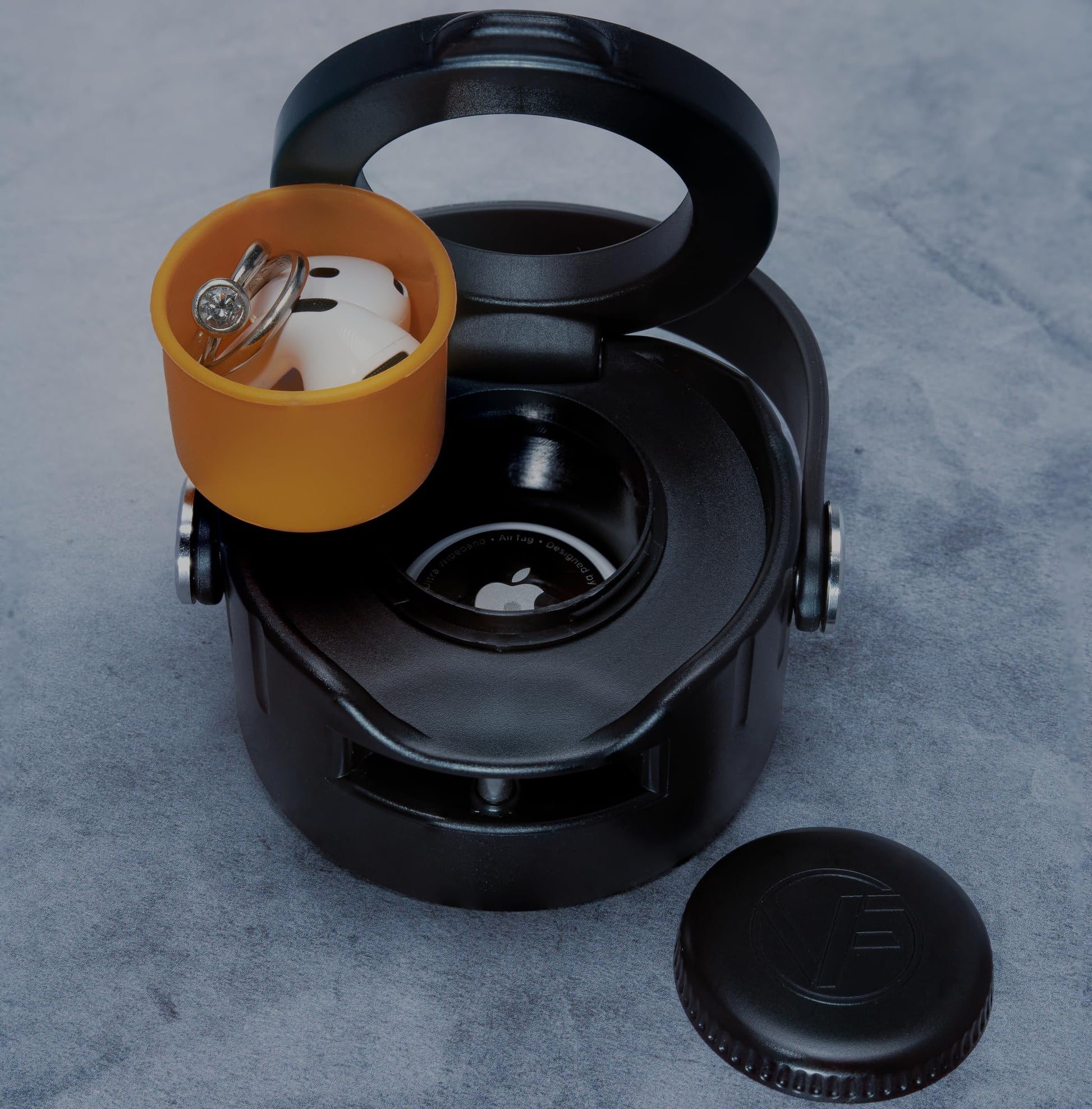 - ⚪ ⚫【Integrated AirTag/Tile Sticker Compartment】- Easily keep track of your water bottle with the dedicated compartment that securely holds your Apple AirTag or Tile Sticker. Track its whereabouts anytime through your phone, ensuring it's never misplaced. (Apple AirTag and Tile Sticker not included)