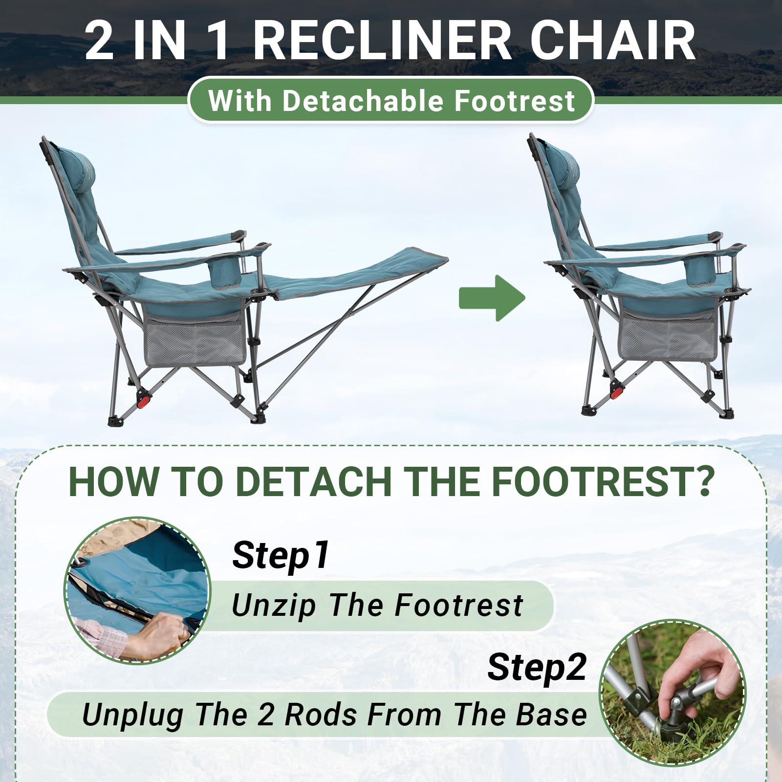 - 2-IN-1 CAMPING CHAIR: The footrest of the reclining camping chair is retractable and can be used as both a lightweight camping chair and a recliner. The backrest can be adjusted at 3 different angles, making it suitable for various scenarios such as the beach, lawn, camping, and parties, etc.