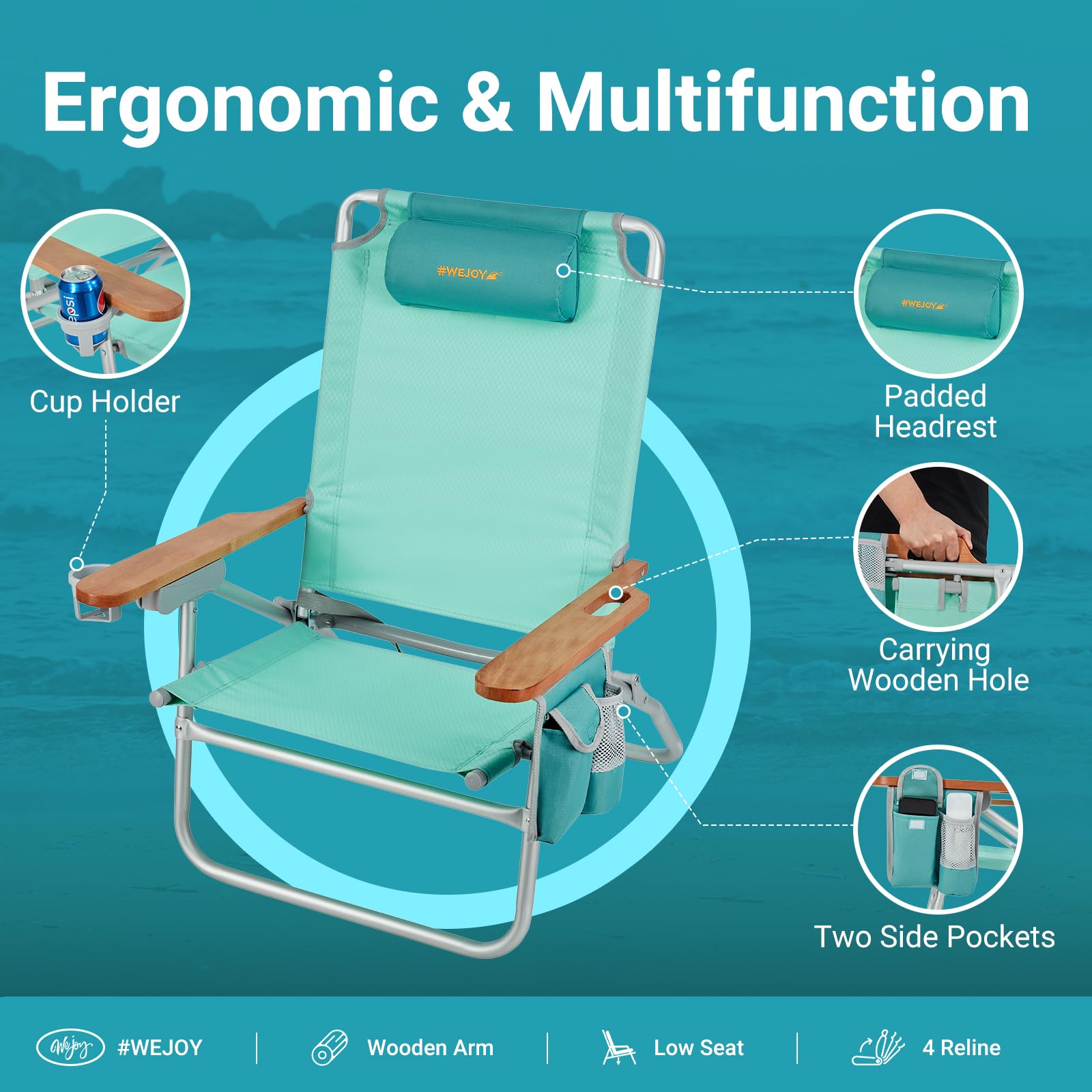 #WEJOY Folding Beach Chair for Adults 4 Position Aluminum Beach Chair with Headrest, Wooden Armrests, Cup Holder for Outdoor Camp Lawn Picnic BBQ Support 300LBS Backpack Folding Reclining Beach Chairs