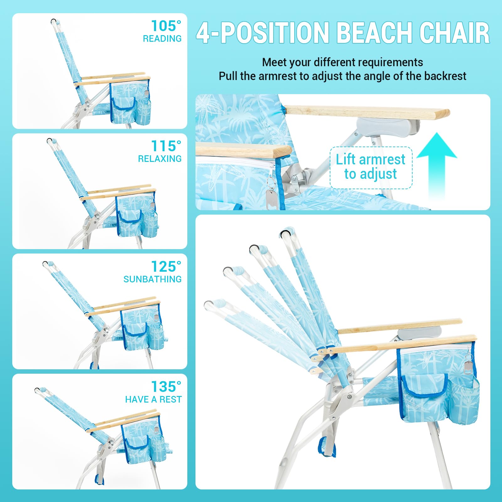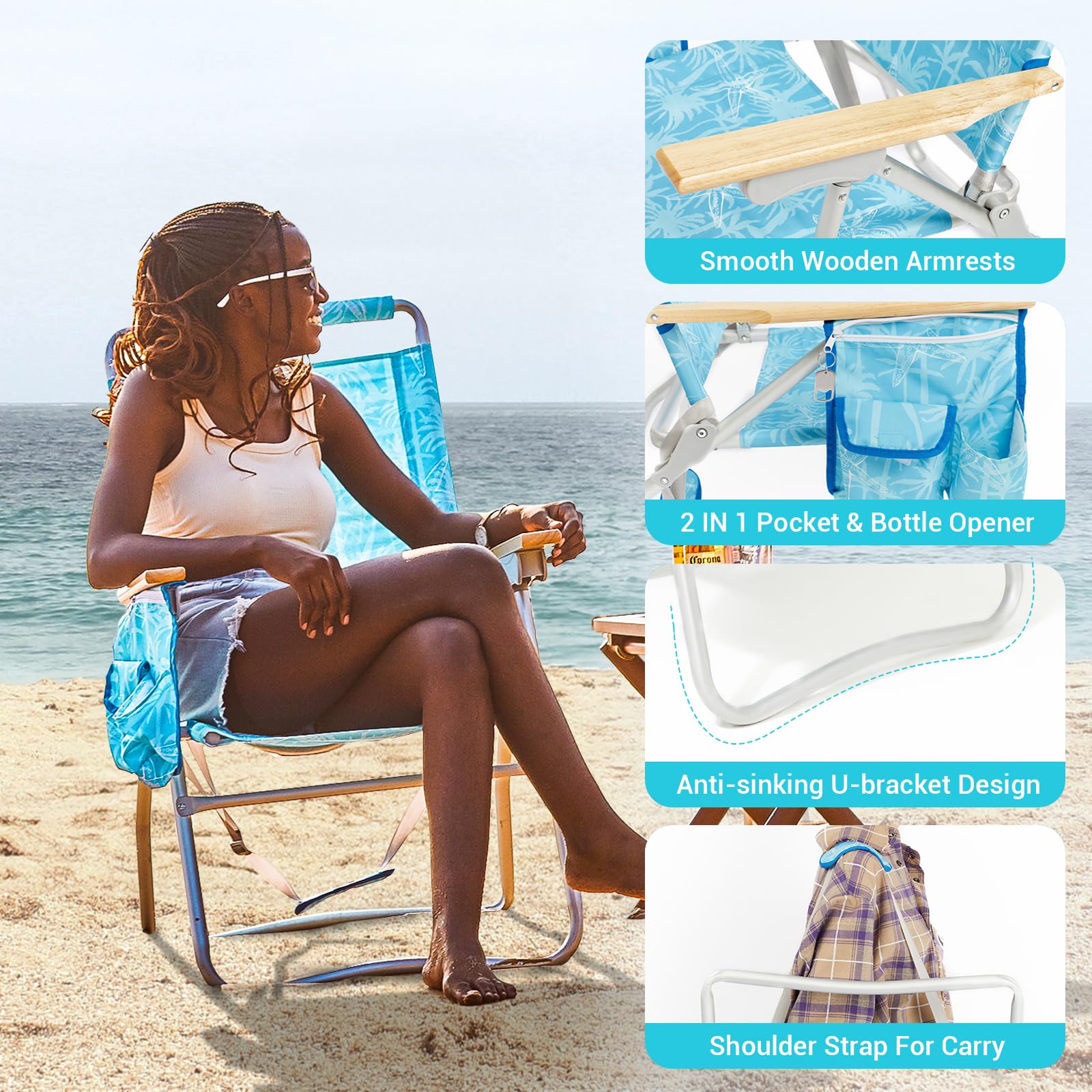 #WEJOY High Back Beach Chair, 4 Position Adjustable Heavy Duty Aluminum Folding Backpack Camping Chairs with Wooden Armrest, Storage Bag & Cup Holders for Outdoor Travel Fishing (Blue White)